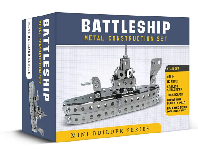 A great gift for those who love construction. This mini construction set includes 152 pieces and all the tools needed to create this metal battleship.