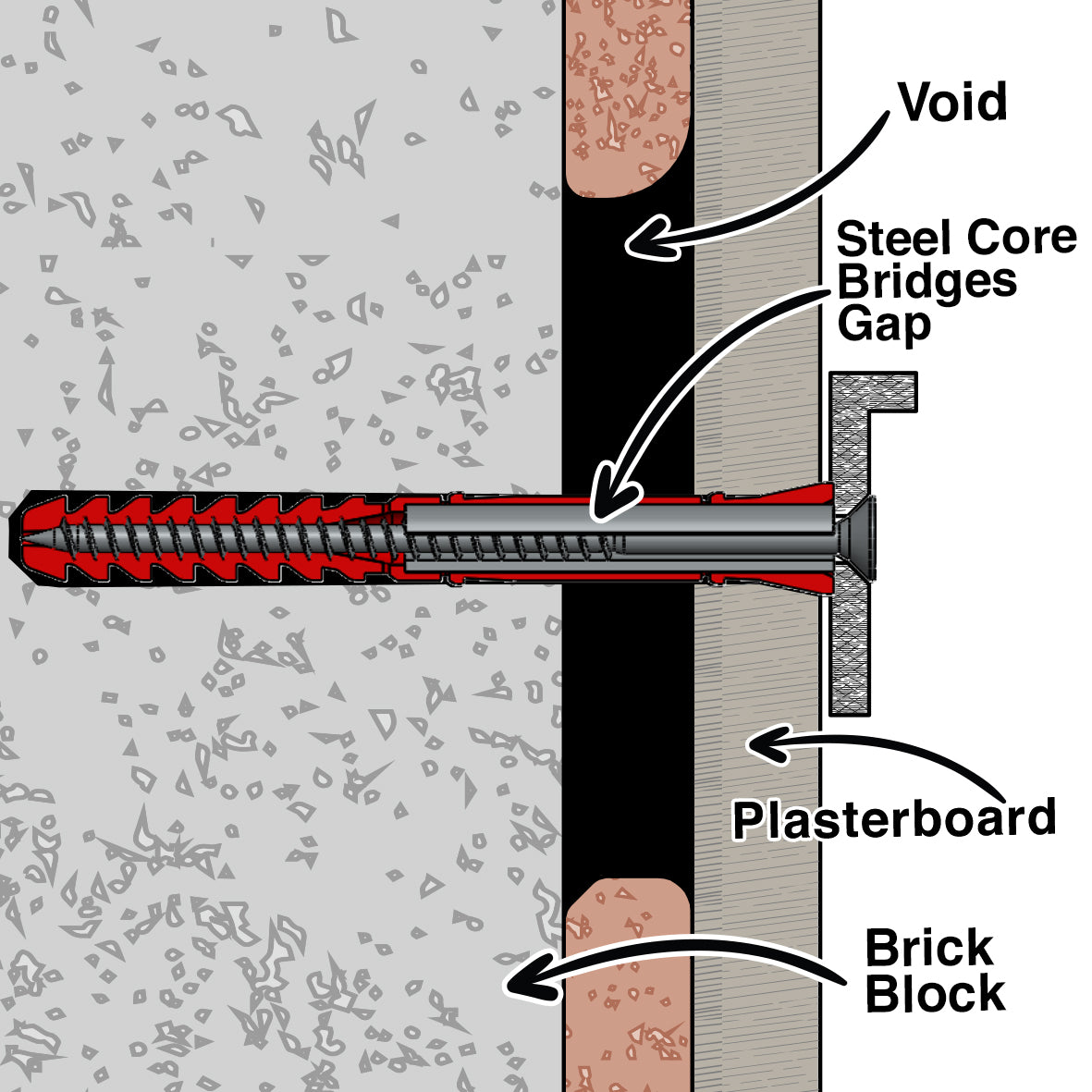 Corefix Connect 100 heavy duty dot & dab wall fixing, easy to install no special tools required, just drill, driver & hammer. Patented system that includes an engineered steel core that bridges the cavity and transfers the load to the blockwork behind. 100mm screw length, 10mm maximum fixture depth, 100kg safe working load using 4 fixings. 4 pack.
