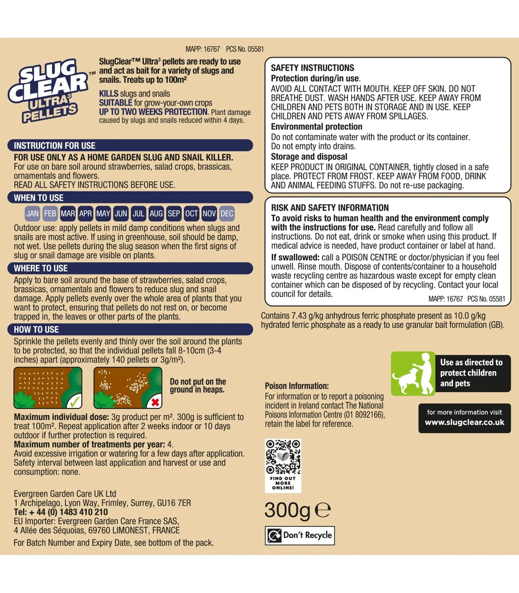 SlugClear™ Ultra 3 kills slugs and snails and protects gardens for up to two weeks. Certified for use in organic gardening, it is suitable for grow your own crops and ideal for salads, strawberries, brassicas and ornamentals. For outdoor and greenhouse use – slugs and snails crawl into hiding in the ground and die. Bottle is made of 100% recycled material and can be recycled.